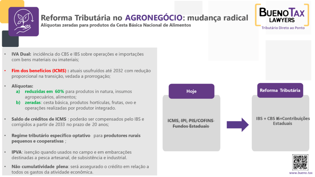 Além de o setor agropecuário ter a redução de 60% na alíquota do novo imposto, resultando em uma tributação efetiva de aproximadamente 11%, e a não tributação de componentes da cesta básica, as exportações continuarão desoneradas, mantendo a competitividade do agronegócio brasileiro no mercado externo.